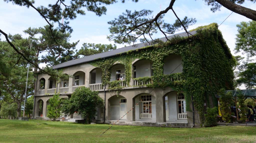 松園別館,松園別館為二層樓的仿洋式拱廊建築,屋頂則使用日式屋瓦,為東西合併的建築風格。